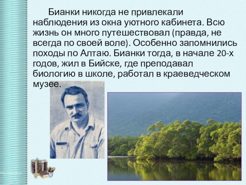 Слайд 6 Бианки никогда не привлекали наблюдения из окна уютного кабинета. Всю жизнь