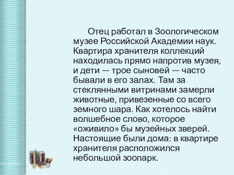 Слайд 3 Отец работал в Зоологическом музее Российской Академии наук. Квартира хранителя коллекций