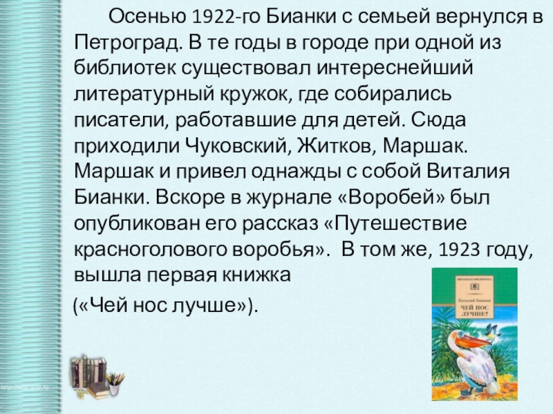 в городе при одной из библиотек существовал интереснейший литературный кружок, где собирались писатели, работавшие для детей. Сюда приходили Чуковский, Житков, Маршак. Маршак и привел однажды с собой Виталия Бианки. Вскоре в журнале «Воробей» был опубликован его рассказ «Путешествие красноголового воробья». В том же, 1923 году, вышла первая книжка