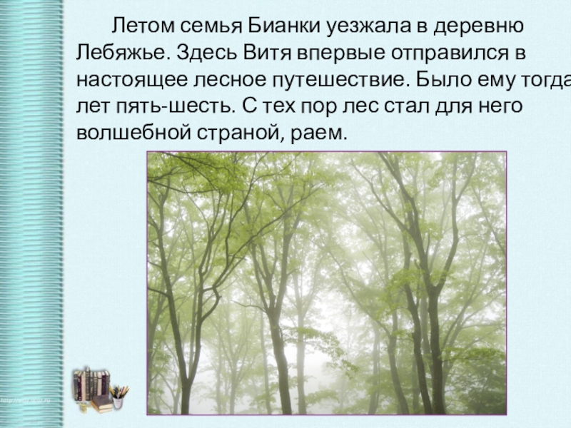 Слайд 4 Летом семья Бианки уезжала в деревню Лебяжье. Здесь Витя впервые отправился