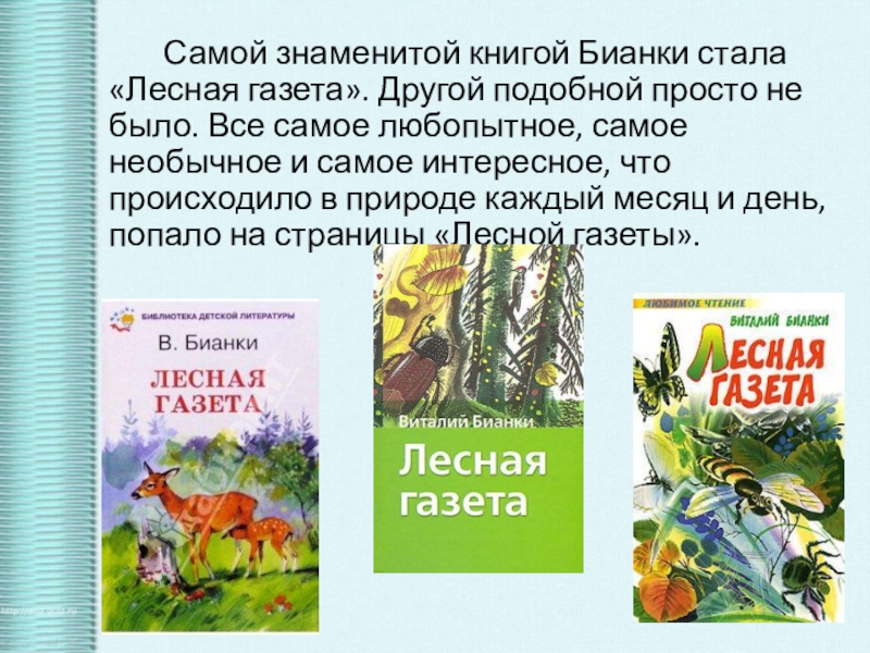 Слайд 8 Самой знаменитой книгой Бианки стала «Лесная газета». Другой подобной просто не