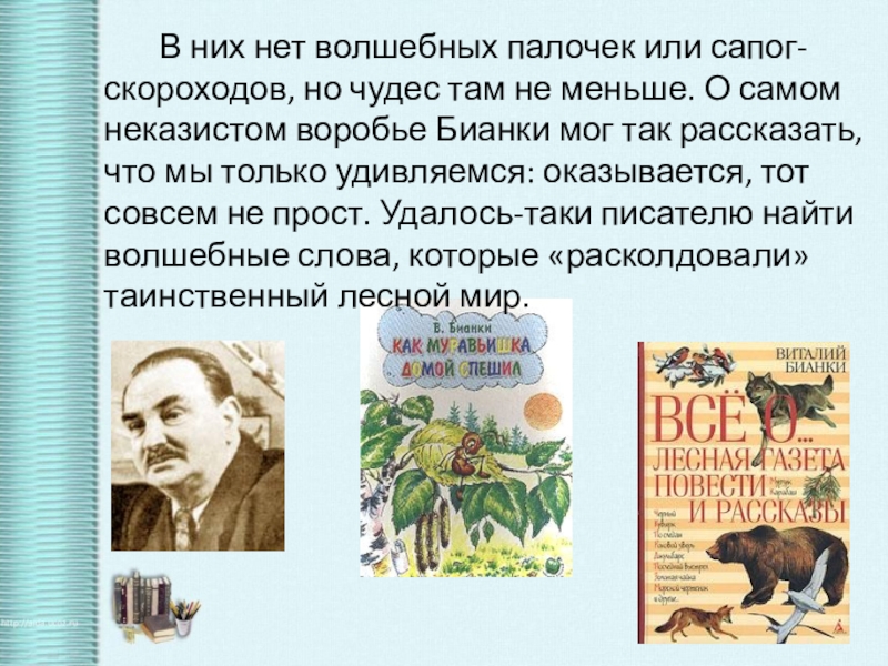 меньше. О самом неказистом воробье Бианки мог так рассказать, что мы только удивляемся: оказывается, тот совсем не прост. Удалось-таки писателю найти волшебные слова, которые «расколдовали» таинственный лесной мир.