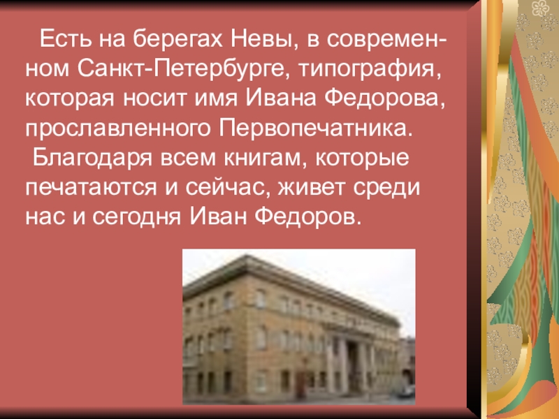 Есть на берегах Невы, в современ-ном Санкт-Петербурге, типография, которая носит