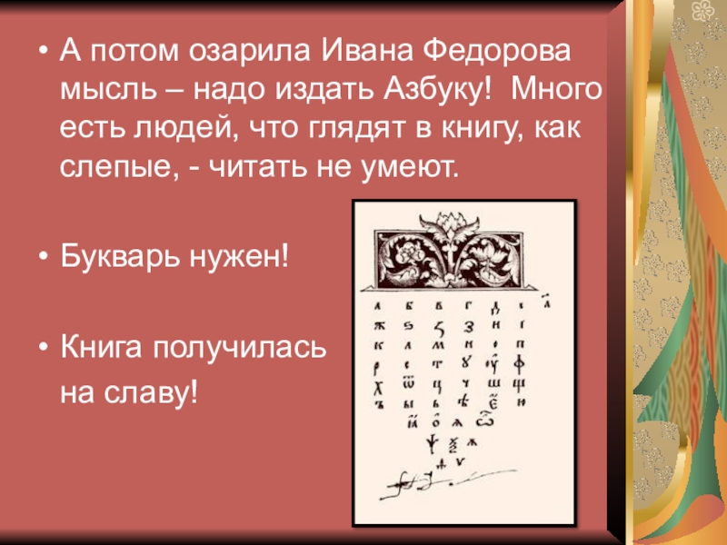 Слайд 11А потом озарила Ивана Федорова мысль – надо издать Азбуку! Много