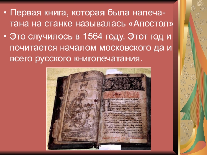 Слайд 9Первая книга, которая была напеча-тана на станке называлась «Апостол»
