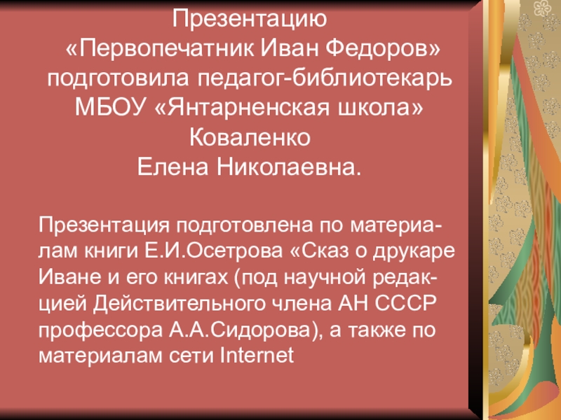 по материа-лам книги Е.И.Осетрова «Сказ о друкаре Иване и его книгах (под научной редак-цией Действительного члена АН СССР профессора А.А.Сидорова), а также по материалам сети Internet