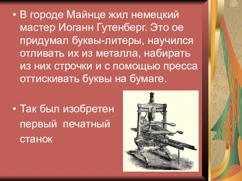 Слайд 7В городе Майнце жил немецкий мастер Иоганн Гутенберг. Это ое придумал