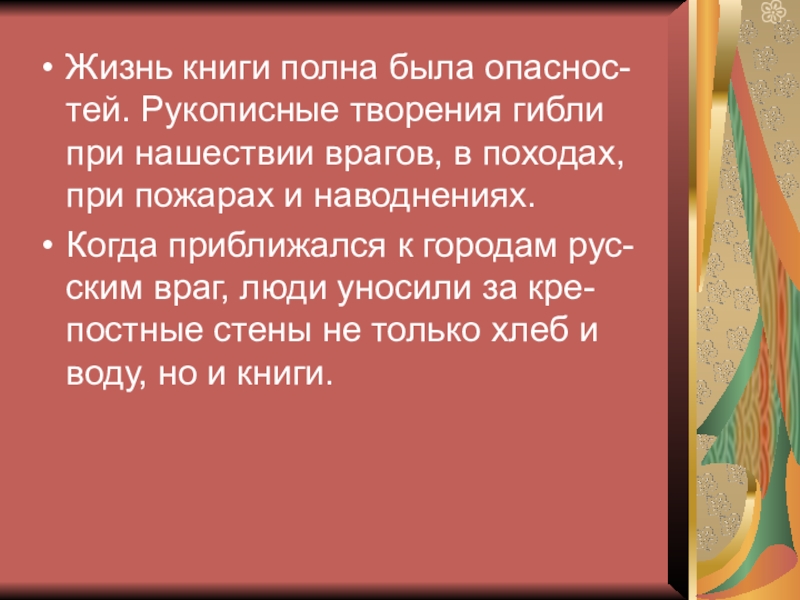 Слайд 6Жизнь книги полна была опаснос-тей. Рукописные творения гибли при нашествии врагов,