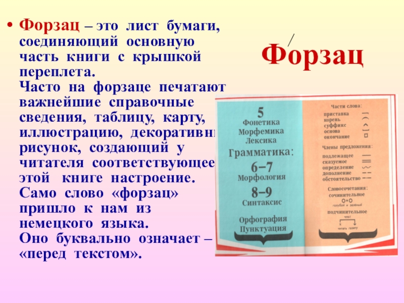 Форзац – это лист бумаги, соединяющий основную часть книги с крышкой переплета. Часто на форзаце печатают важнейшие справочные сведения, таблицу, карту, иллюстрацию, декоративный рисунок, создающий у читателя соответствующее этой книге настроение. Само слово «форзац» пришло к нам из немецкого языка. Оно буквально означает – «перед текстом».