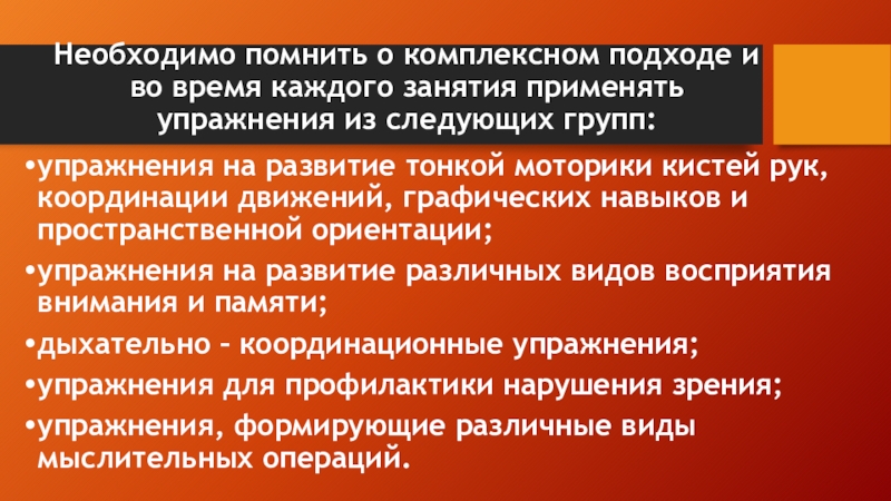 упражнения на развитие тонкой моторики кистей рук, координации движений, графических навыков и пространственной ориентации;