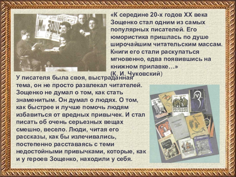 У писателя была своя, выстраданная тема, он не просто развлекал читателей. Зощенко не думал о том, как стать знаменитым. Он думал о людях. О том, как быстрее и лучше помочь людям избавиться от вредных привычек. И стал писать об очень серьезных вещах смешно, весело. Люди, читая его рассказы, как бы излечивались, постепенно расставаясь с теми недостойными привычками, которые, как и у героев Зощенко, находили у себя.