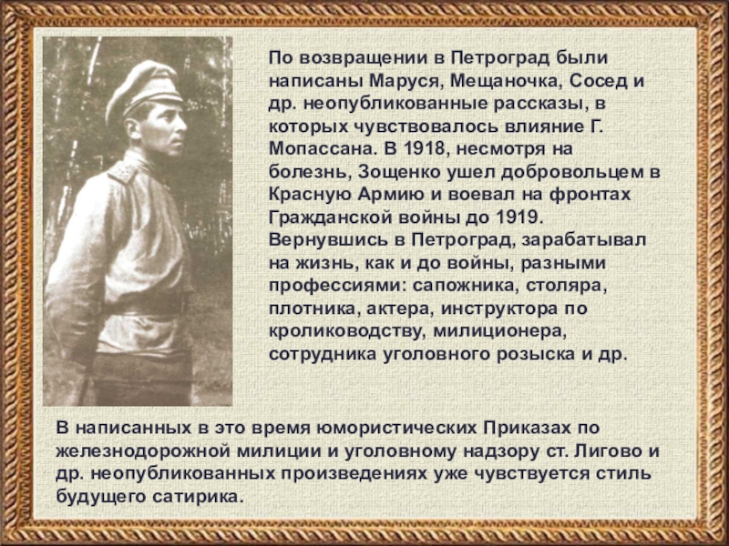 В написанных в это время юмористических Приказах по железнодорожной милиции и уголовному надзору ст. Лигово и др. неопубликованных произведениях уже чувствуется стиль будущего сатирика.