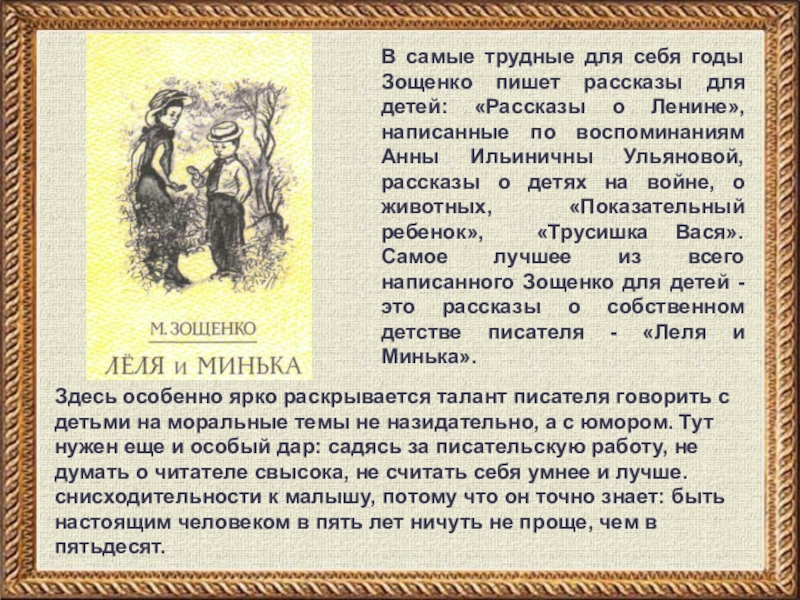 Здесь особенно ярко раскрывается талант писателя говорить с детьми на моральные темы не назидательно, а с юмором. Тут нужен еще и особый дар: садясь за писательскую работу, не думать о читателе свысока, не считать себя умнее и лучше. снисходительности к малышу, потому что он точно знает: быть настоящим человеком в пять лет ничуть не проще, чем в пятьдесят.