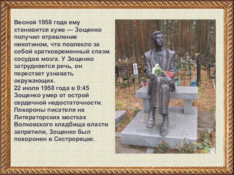 Самым печальным следствием этой идеологической кампании стало обострение душевной болезни, не позволявшее писателю полноценно работать. Восстановление его в Союзе писателей после смерти Сталина (1953) и издание первой после долгого перерыва книги (1956) принесли лишь временное облегчение его состояния. После достижения пенсионного возраста (в 1954 г.) и до самой смерти Зощенко было отказано в пенсии.