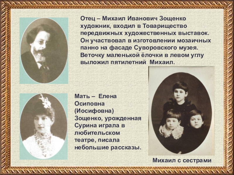 Мать – Елена Осиповна (Иосифовна) Зощенко, урожденная Сурина играла в любительском театре, писала небольшие рассказы.