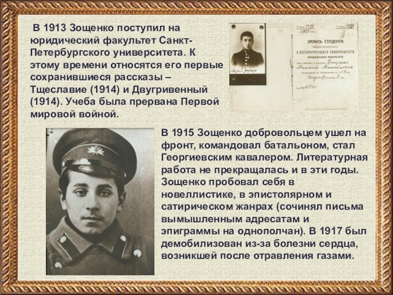 В 1915 Зощенко добровольцем ушел на фронт, командовал батальоном, стал Георгиевским кавалером. Литературная работа не прекращалась и в эти годы. Зощенко пробовал себя в новеллистике, в эпистолярном и сатирическом жанрах (сочинял письма вымышленным адресатам и эпиграммы на однополчан). В 1917 был демобилизован из-за болезни сердца, возникшей после отравления газами.