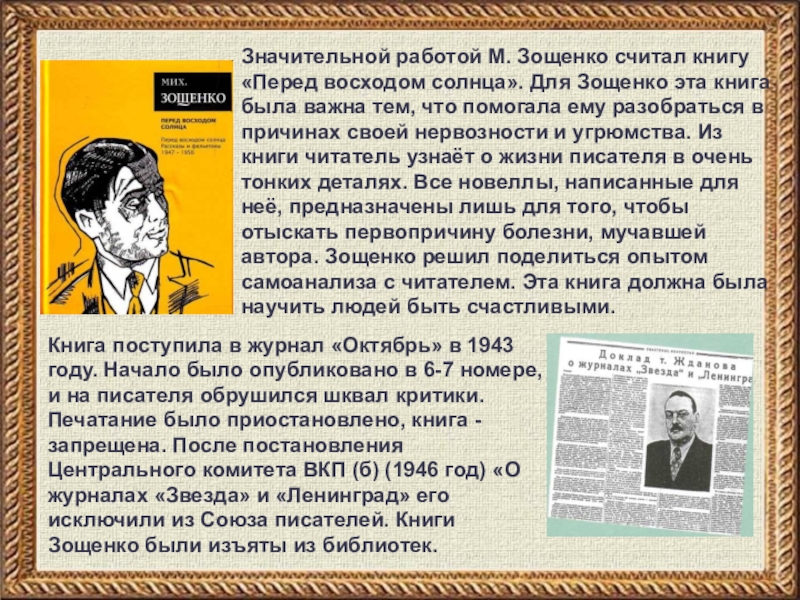 Книга поступила в журнал «Октябрь» в 1943 году. Начало было опубликовано в 6-7 номере, и на писателя обрушился шквал критики. Печатание было приостановлено, книга - запрещена. После постановления Центрального комитета ВКП (б) (1946 год) «О журналах «Звезда» и «Ленинград» его исключили из Союза писателей. Книги Зощенко были изъяты из библиотек.