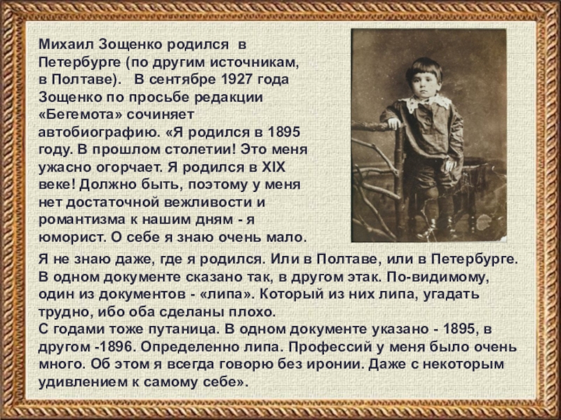 Я не знаю даже, где я родился. Или в Полтаве, или в Петербурге. В одном документе сказано так, в другом этак. По-видимому, один из документов - «липа». Который из них липа, угадать трудно, ибо оба сделаны плохо.