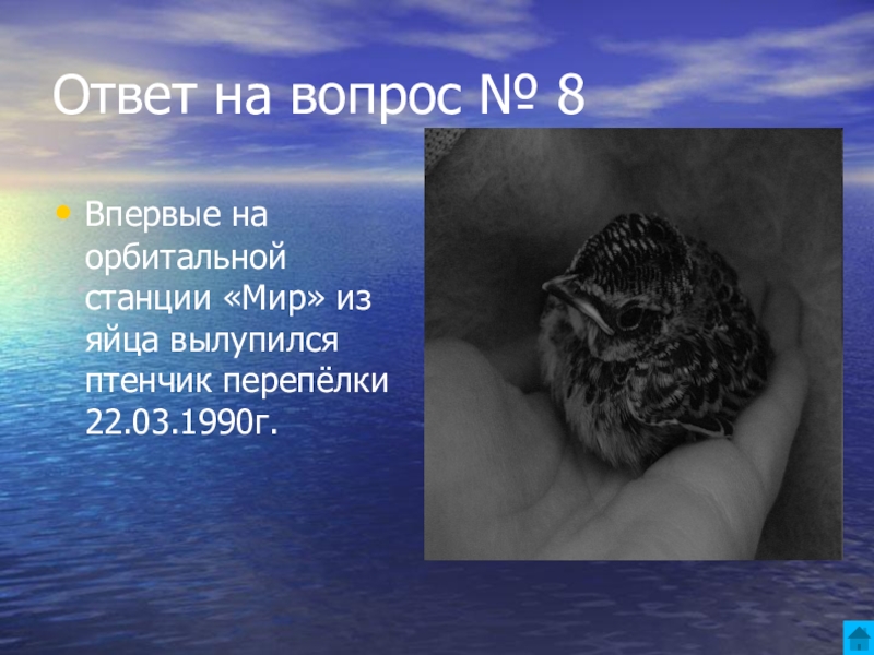 Ответ на вопрос № 8Впервые на орбитальной станции «Мир» из яйца вылупился птенчик перепёлки 22.03.1990г.