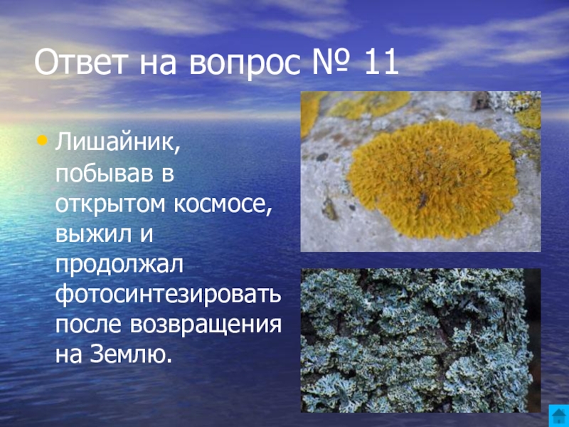 Ответ на вопрос № 11Лишайник, побывав в открытом космосе, выжил и продолжал фотосинтезировать после возвращения на Землю.