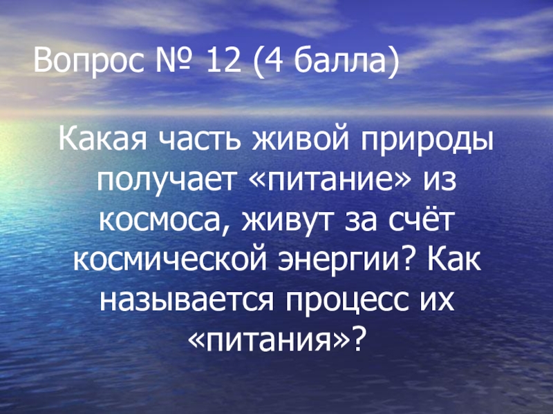 Вопрос № 12 (4 балла)Какая часть живой природы получает «питание» из космоса, живут за счёт космической энергии?