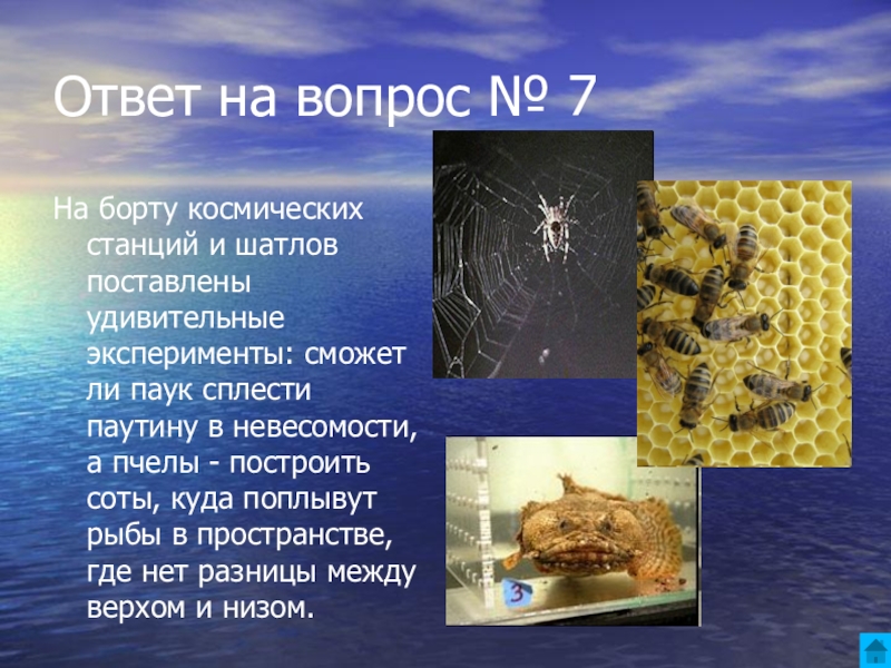 Ответ на вопрос № 7На борту космических станций и шатлов поставлены удивительные эксперименты: сможет ли паук сплести