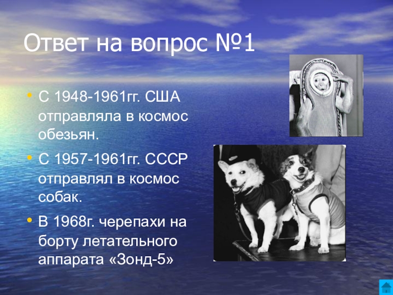 Ответ на вопрос №1С 1948-1961гг. США отправляла в космос обезьян.С 1957-1961гг. СССР отправлял в космос собак.В 1968г.