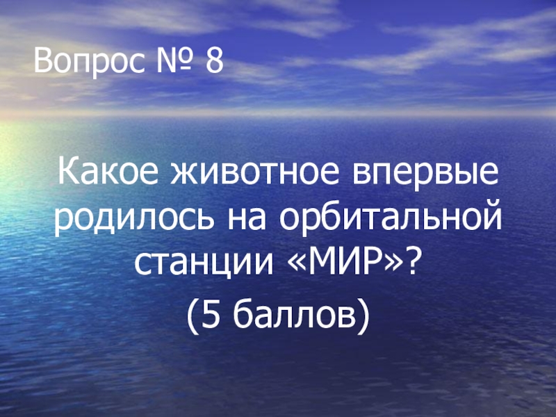 Вопрос № 8Какое животное впервые родилось на орбитальной станции «МИР»?(5 баллов)