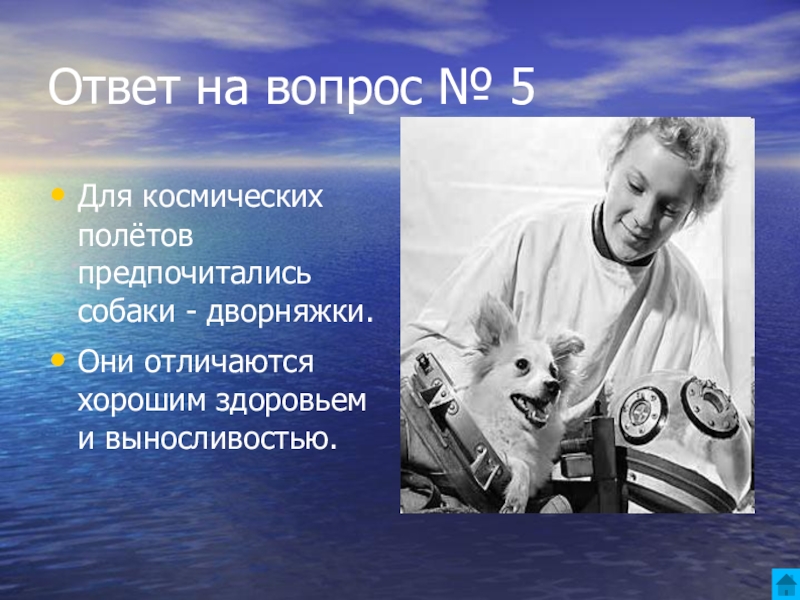 Ответ на вопрос № 5Для космических полётов предпочитались собаки - дворняжки.Они отличаются хорошим здоровьем и выносливостью.