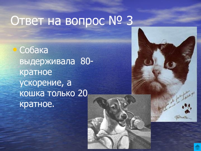 Ответ на вопрос № 3 Собака выдерживала 80-кратное ускорение, а кошка только 20 кратное.