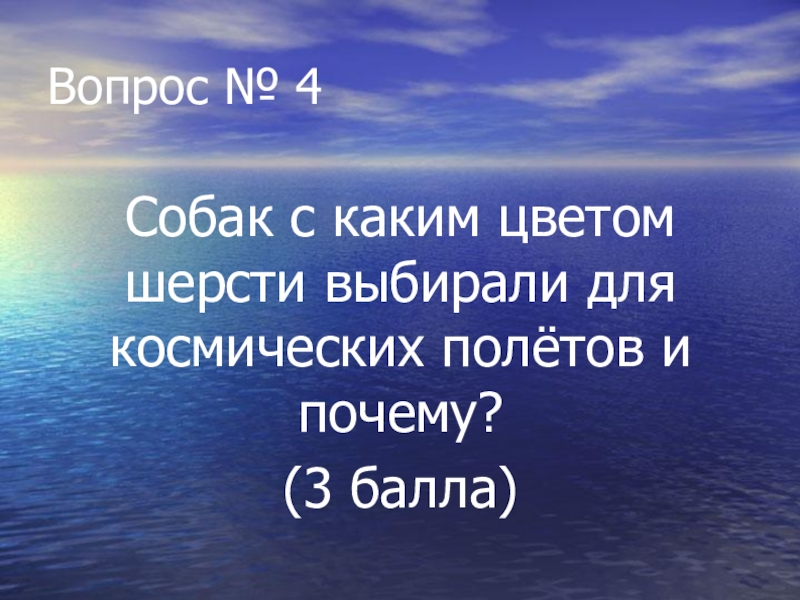 Вопрос № 4Собак с каким цветом шерсти выбирали для космических полётов и почему?(3 балла)