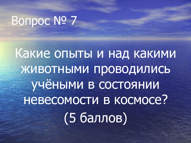 Вопрос № 7Какие опыты и над какими животными проводились учёными в состоянии невесомости в космосе?(5 баллов)