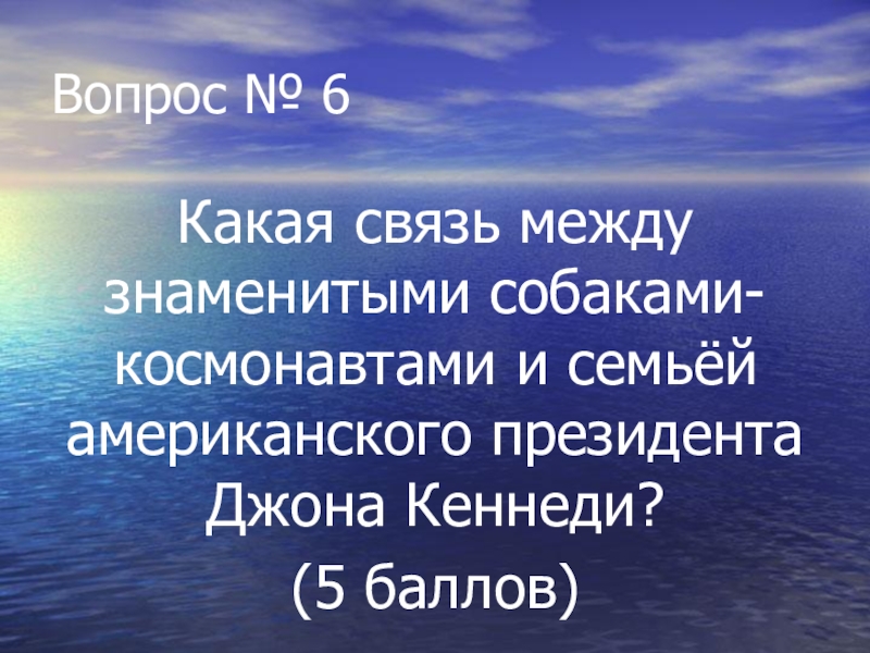 Вопрос № 6Какая связь между знаменитыми собаками-космонавтами и семьёй американского президента Джона Кеннеди?(5 баллов)