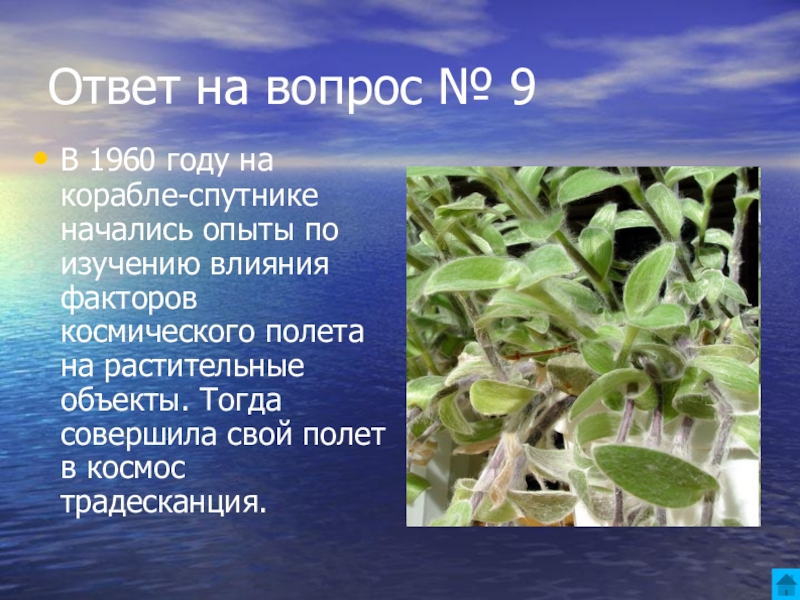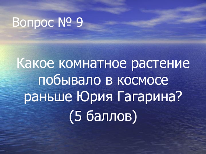 Вопрос № 9Какое комнатное растение побывало в космосе раньше Юрия Гагарина?(5 баллов)