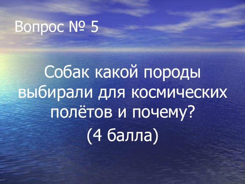 Вопрос № 5Собак какой породы выбирали для космических полётов и почему?(4 балла)
