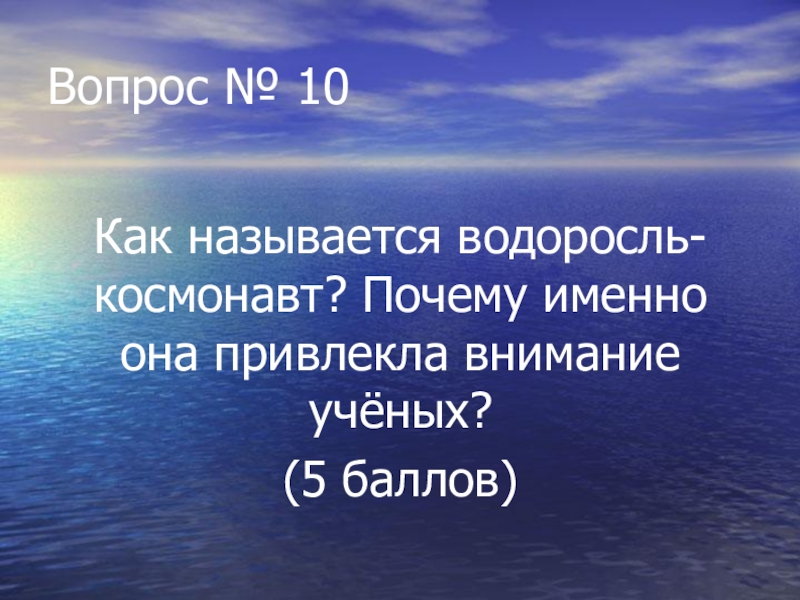 Вопрос № 10Как называется водоросль-космонавт? Почему именно она привлекла внимание учёных?(5 баллов)