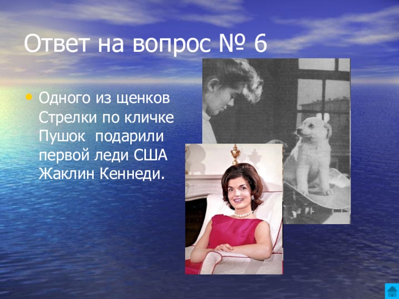 Ответ на вопрос № 6Одного из щенков Стрелки по кличке Пушок подарили первой леди США Жаклин Кеннеди.