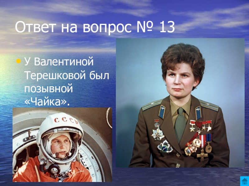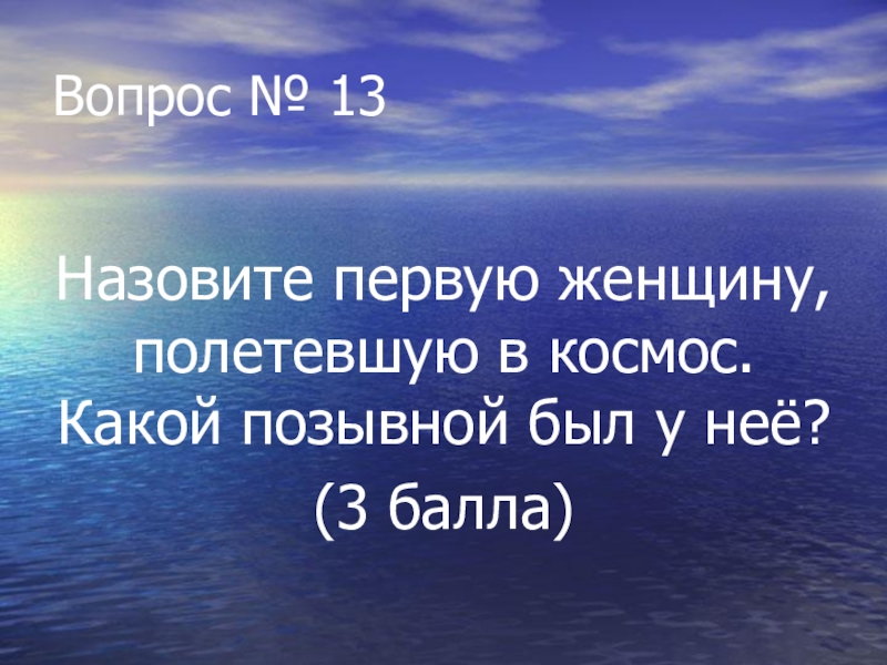 Вопрос № 13Назовите первую женщину, полетевшую в космос. Какой позывной был у неё?(3 балла)