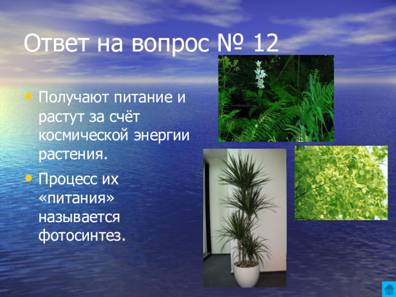 Ответ на вопрос № 12Получают питание и растут за счёт космической энергии растения.Процесс их «питания» называется фотосинтез.