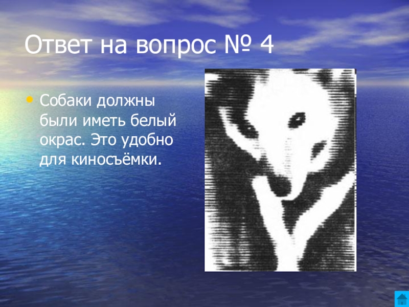 Ответ на вопрос № 4Собаки должны были иметь белый окрас. Это удобно для киносъёмки.