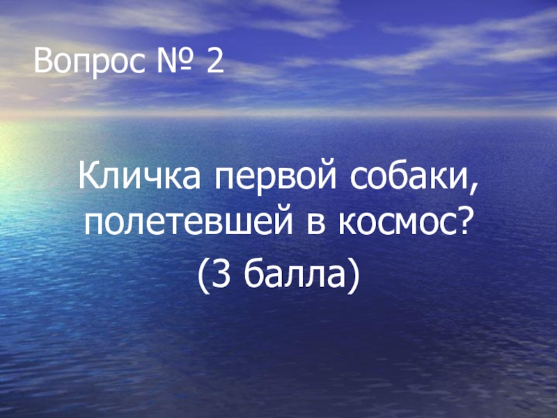 Вопрос № 2Кличка первой собаки, полетевшей в космос?(3 балла)