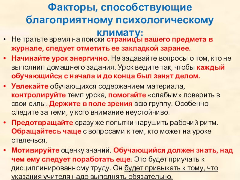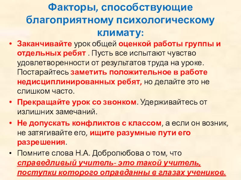 Слайд 17Факторы, способствующие благоприятному психологическому климату: