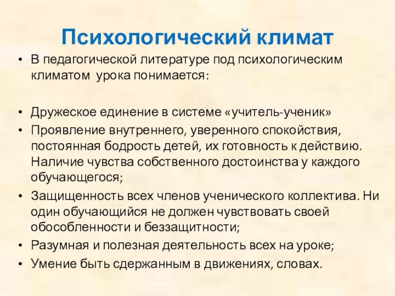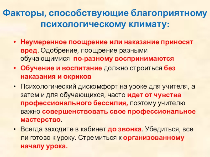 Слайд 16Факторы, способствующие благоприятному психологическому климату: