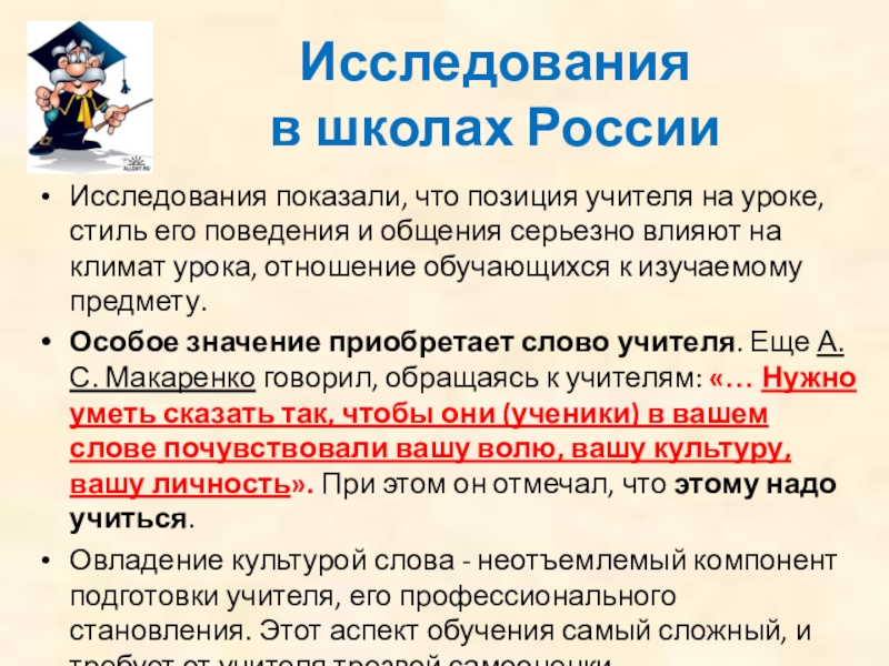 Особое значение приобретает слово учителя. Еще А.С. Макаренко говорил, обращаясь к учителям: «… Нужно уметь сказать так, чтобы они (ученики) в вашем слове почувствовали вашу волю, вашу культуру, вашу личность». При этом он отмечал, что этому надо учиться.