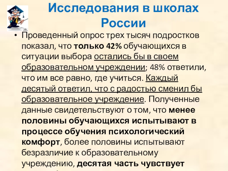 42% обучающихся в ситуации выбора остались бы в своем образовательном учреждении; 48% ответили, что им все равно, где учиться. Каждый десятый ответил, что с радостью сменил бы образовательное учреждение. Полученные данные свидетельствуют о том, что менее половины обучающихся испытывают в процессе обучения психологический комфорт, более половины испытывают безразличие к образовательному учреждению, десятая часть чувствует дискомфорт.