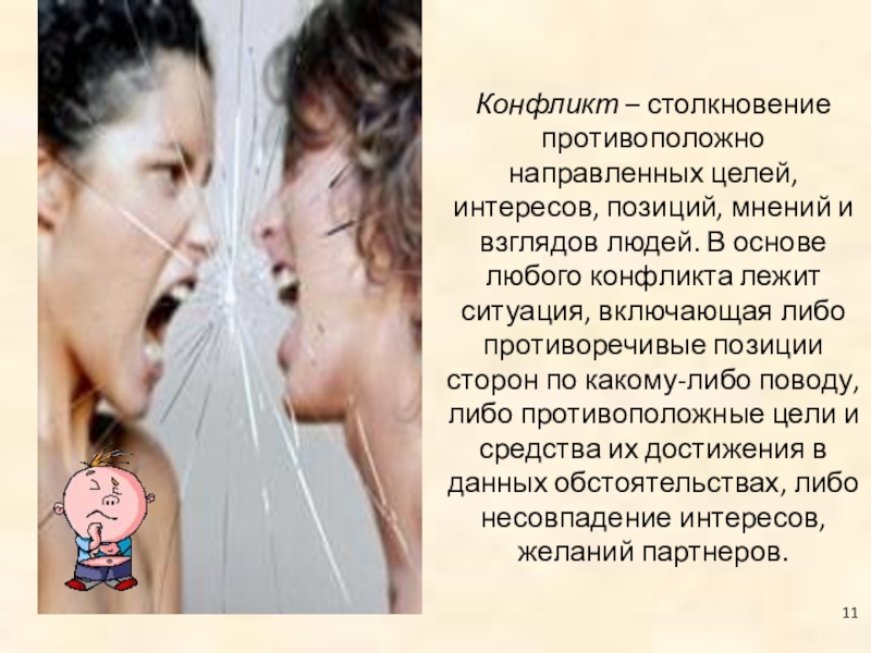 Слайд 11Конфликт – столкновение противоположно направленных целей, интересов, позиций, мнений и взглядов