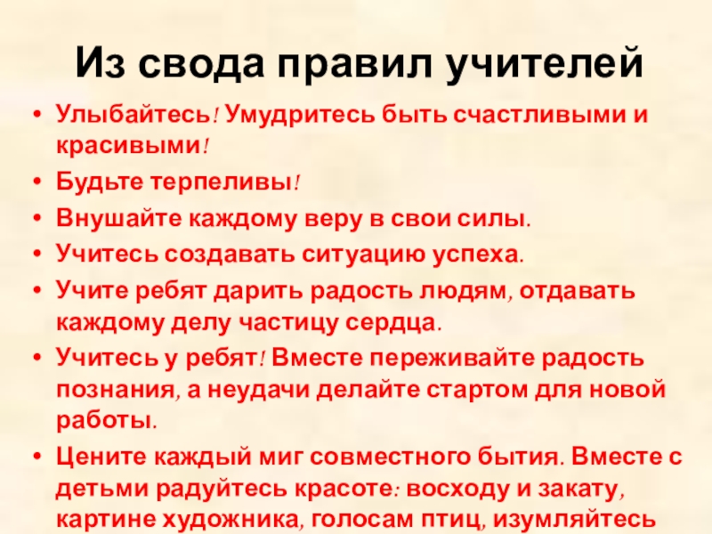 Учите ребят дарить радость людям, отдавать каждому делу частицу сердца.