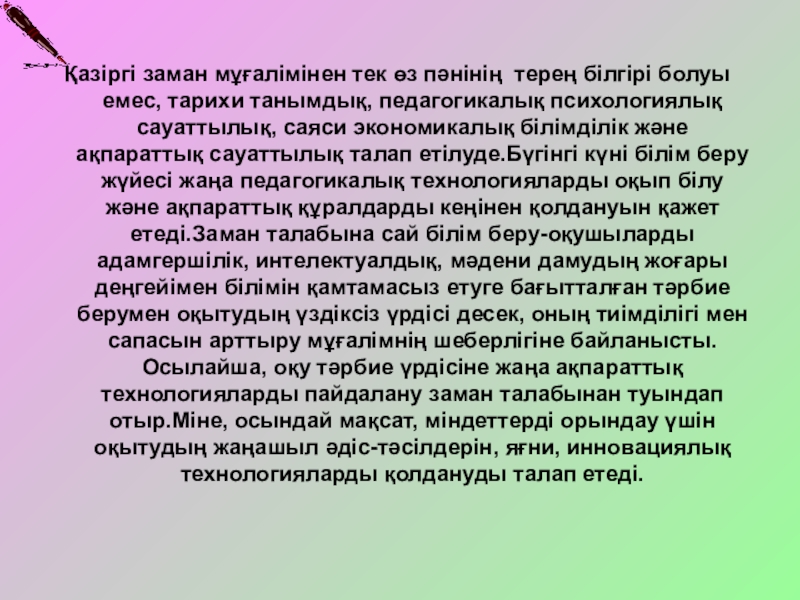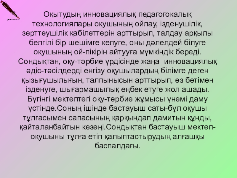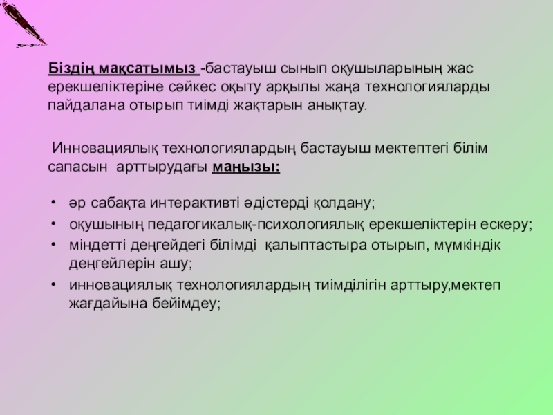 инновациялық технологиялардың тиімділігін арттыру,мектеп жағдайына бейімдеу;