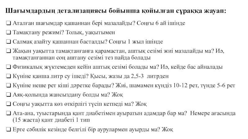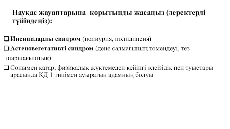 Слайд 7Науқас жауаптарына қорытынды жасаңыз (деректерді түйіндеңіз):