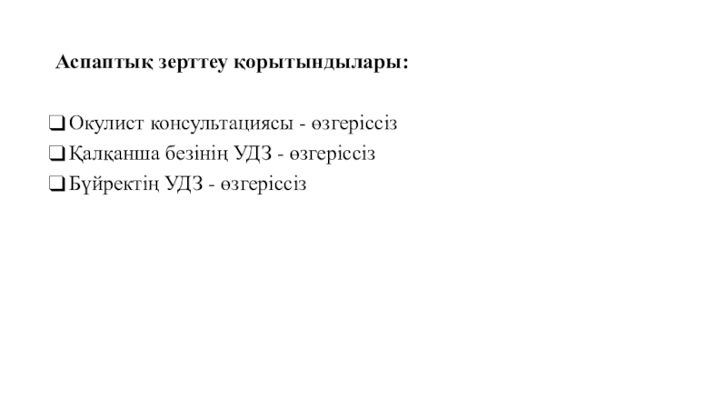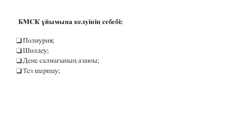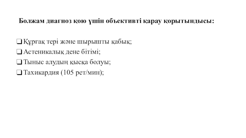 Слайд 8Болжам диагноз қою үшін объективті қарау қорытындысы: